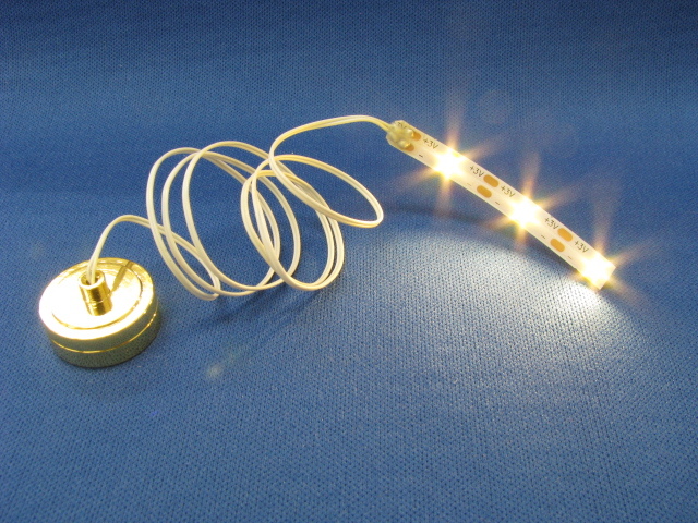 電池式のLED照明です!!薄いストリップにLEDチップが3個ついており、とても明るいです!ダウンライトやお部屋の照明の補助としてお使いいただくのにピッタリです。ストリップ部分は薄く、自由に曲げることもできますので、ドールハウスの小さな隙間にお使いいただけます。ぜひあなたのドールハウスにお役立てください!